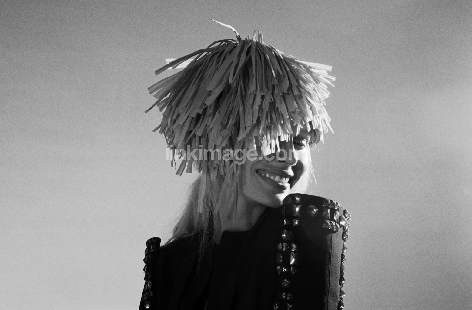 - girl, female, model, fashion, hair, headdress, hat, mop, strips, head, smile, happy, rivets, sleevelets, frenchman, fringed