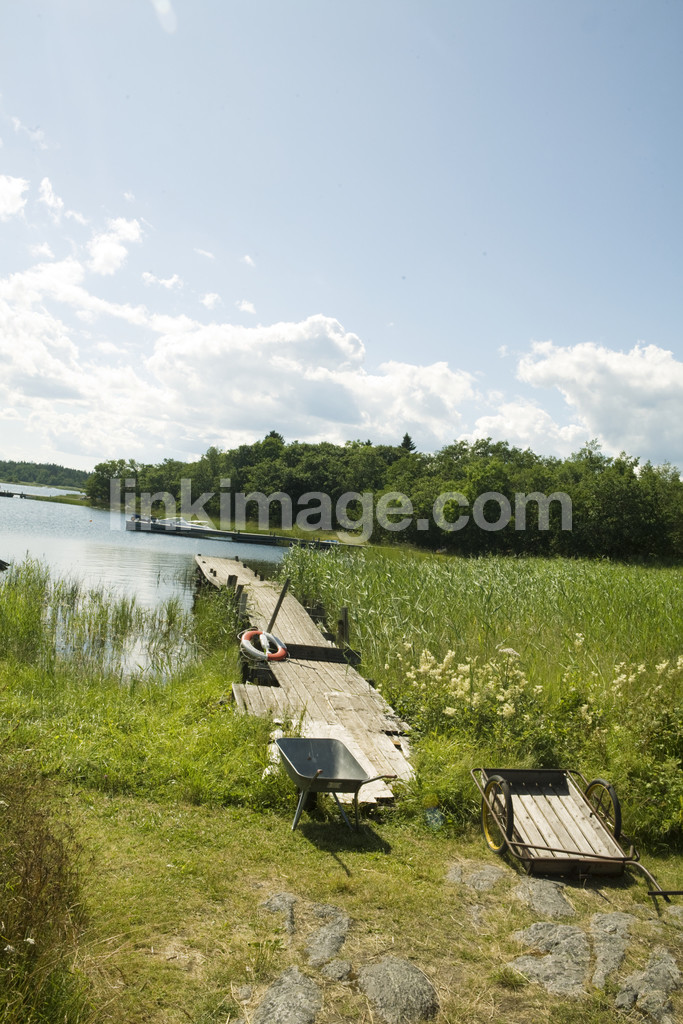 - bridge, abandoned, summer, lifebuoy, wheelbarrow, archipelago, wheeler, car, idyll, quiet, view, reed, water