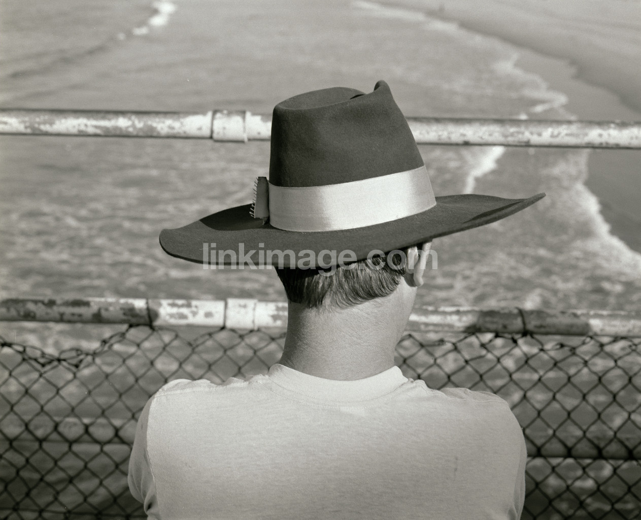 - male, guy, hat, back, summer, sea, water, fence, railing