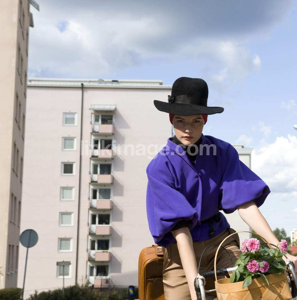 - female, girl, fashion, model, beauty, hat, gaze, flower, basket, flowers, cycling, house, rise, bag, fenugreek, governance, handle, purple
