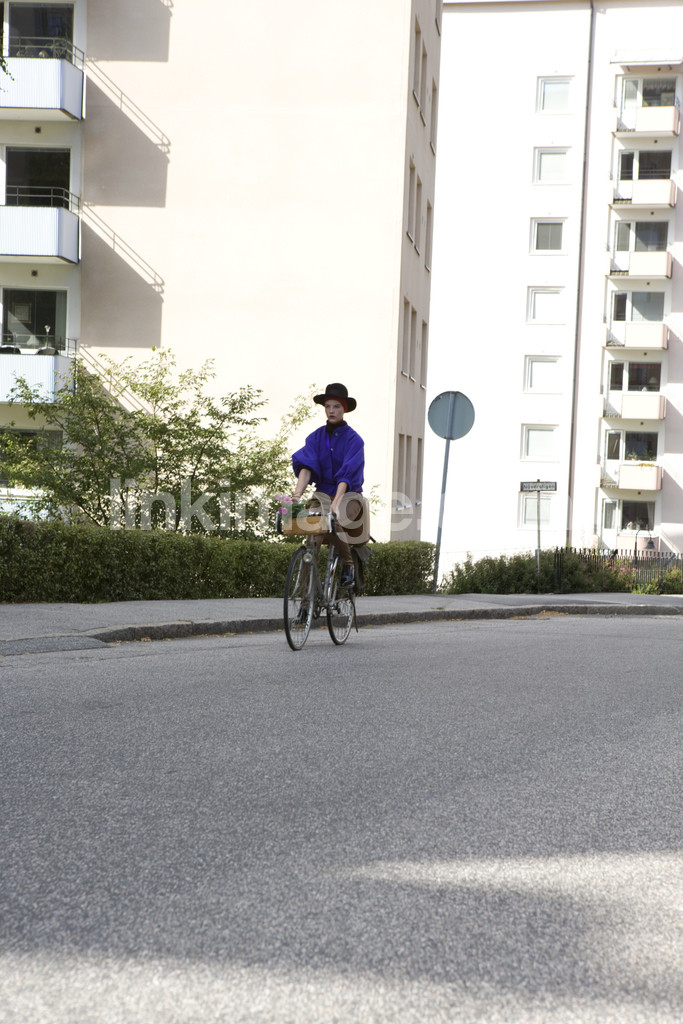 - cycle, mountain biking, excursion, påväg, speed, asphalt, road, house, houses, summer, girl, female, hat, basket, city