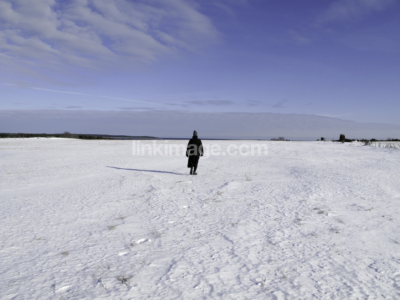 - human, walk, view, spot, winter, late winter, horizon, snow, sky, blue, cloud, alone, an, peace, quiet, harmony, freedom