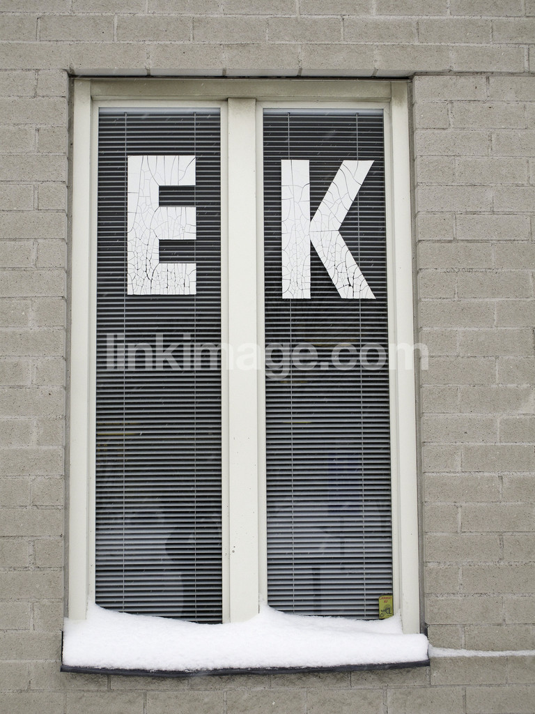 window, blinds, letter, letters, winter, snow, e, k, elongated, windowsill, worn, wall, house