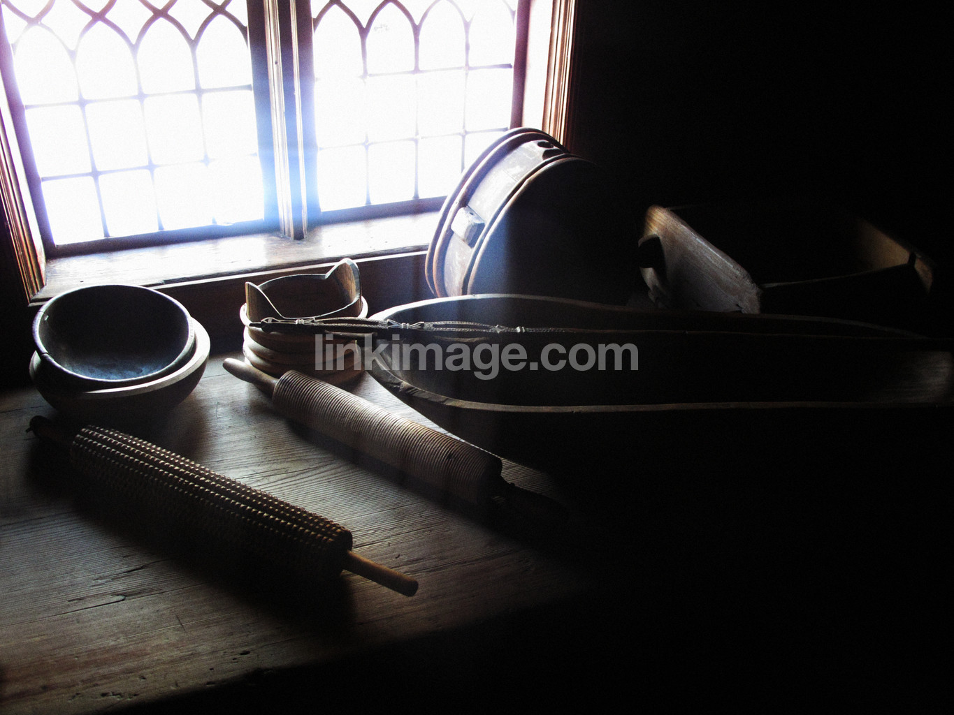 rolling pin, bread, back, baking, bench, wood, basket, window, light, details, fine