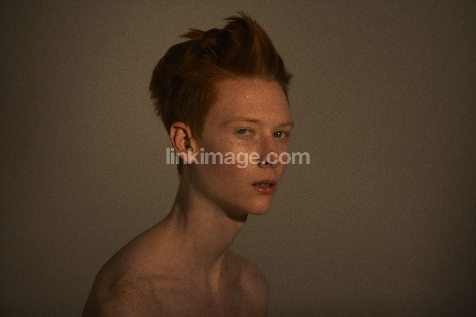 - girl, female, shorthaired, redhead, vulnerable, unadorned, collarbone, sitting, naked, gaze, portrait