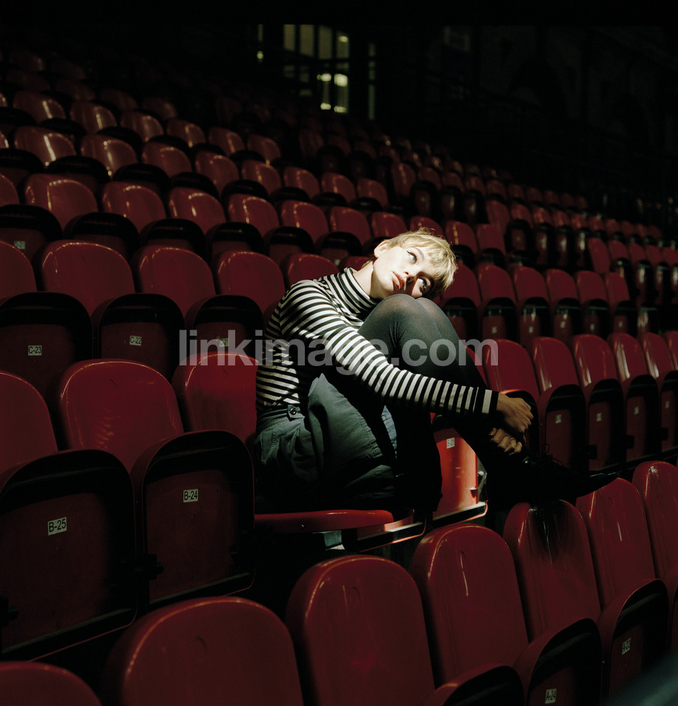 - female, girl, striped, polo, turtleneck, knee, chair, sitting, bleachers, salon, auditorium, cinema, seating, red, chairs, rows, alone, solitary, fashion, model, thinking, skirt
