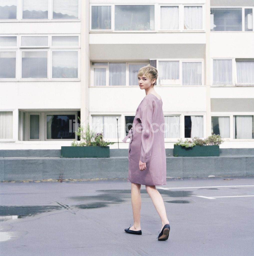 - female, girl, fashion, model, street, parking, house, houses, window, purple, dress, bare legs, ballerina, shoes, puddle, backward
