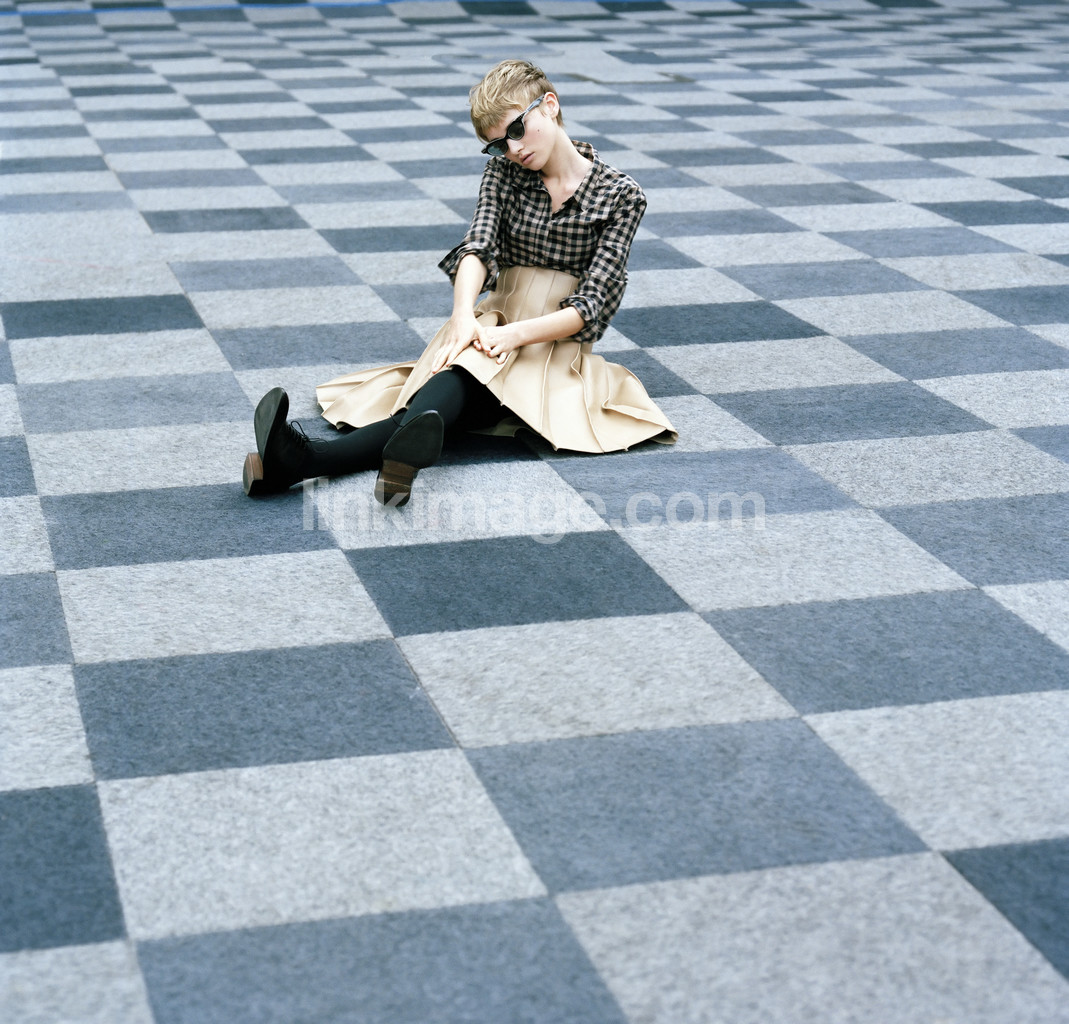 - girl, female, model, fashion, skirt, shirt, blouse, sunglasses, short, hair, shorthaired, sitting, street, floor, squares, pattern, gray, stone, shades