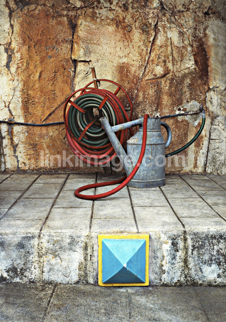 - stone wall, pavement, water hose, rolled up, ranking, watering can, enamel, box, tube, red, sland, blue, stop, graphic, jug