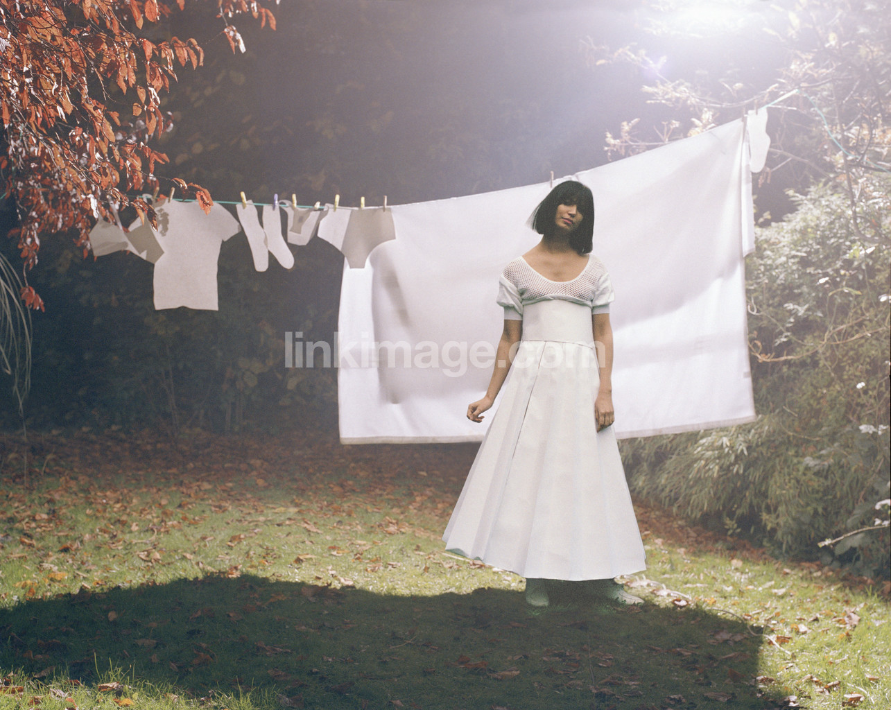 - female, girl, fashion, model, mistress, housewife, wash, hanging, white, dressed in white, dress, classical, single, hosiery, sheets, light, threat, underwear, garden