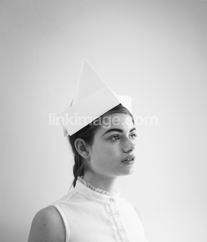 - girl, female, portrait, fashion, model, paper, hat, båthatt, linen, collar, tip, profile, braid, headdress, face, shoulders, white, buttons