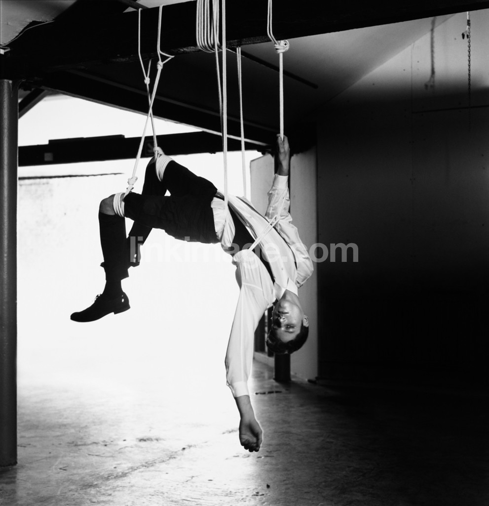 - male, guy, fashion, model, bag, rep, inanimate, ceiling, tied, shirt, light, shorts, hosiery, suspended, arm, death, sleep