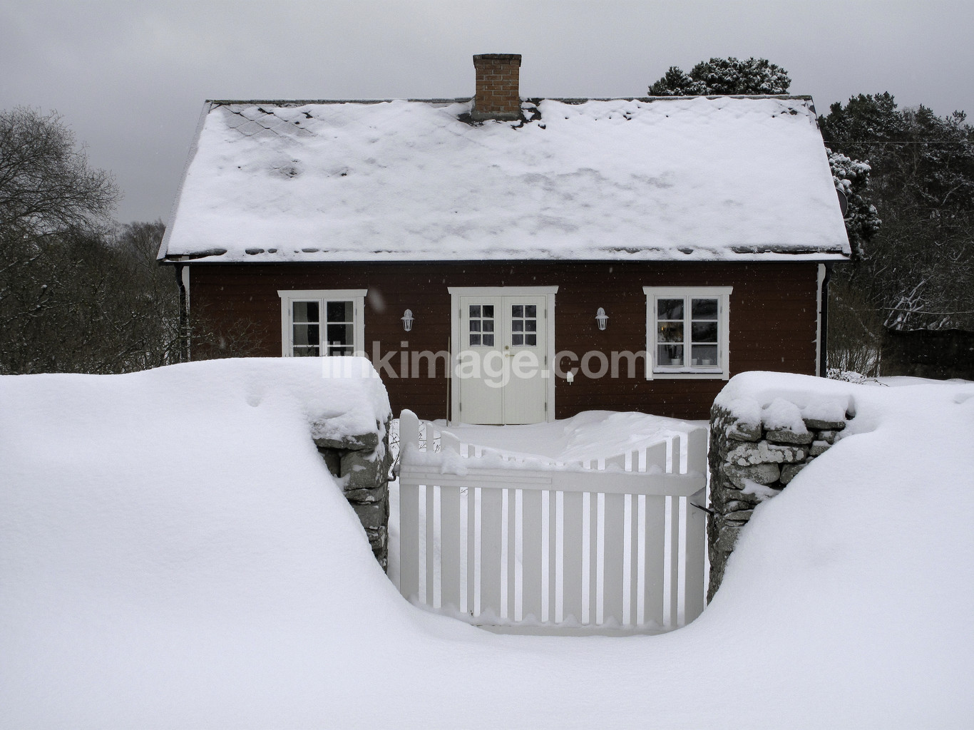 cottage, house, winter, snow, rest, cold, weather, red, cozy, gate, leisure, homes, lodging, stone, övesnöad