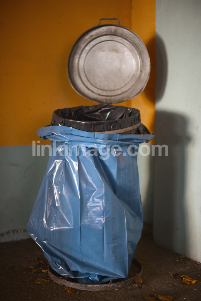 - dustbin, trash bag, garbage bag, bag, blue, plastic, cap, metal, open, corner, environment, toss, protect, on