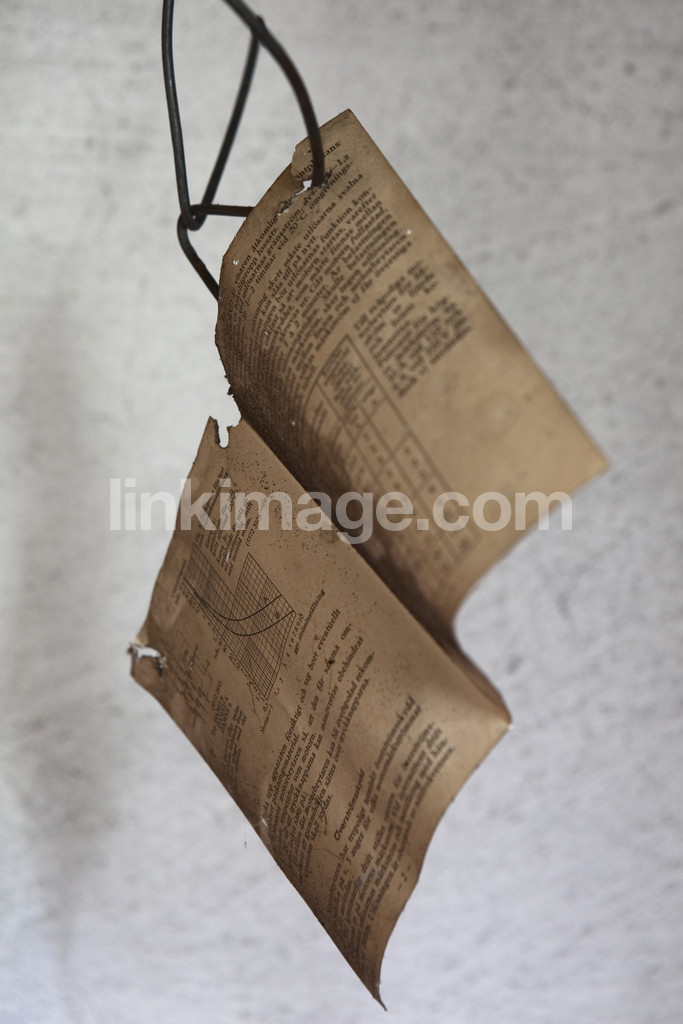 paper, booklet, suspended, bag, old, yellowed, yellow, instructions, rust, string, wall, white, holes