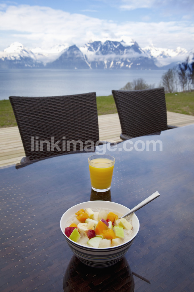 - fruit salad, fruits, meal, eat, juice, juice, orange, views, rock, view, water, lake, porch, patio, patio furniture, rattan, reflection