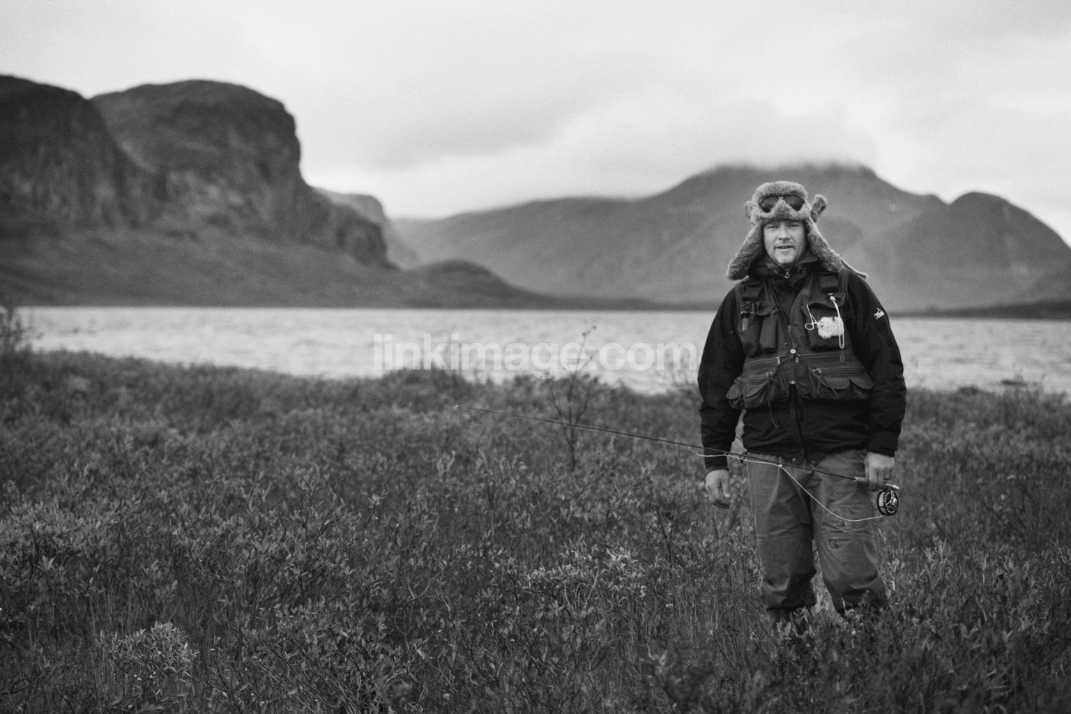 male, guy, fur hat, fishing, fish, fishing rod, west, grass, lake, water, mountain, rock, hilly, cloud, friiluftsliv