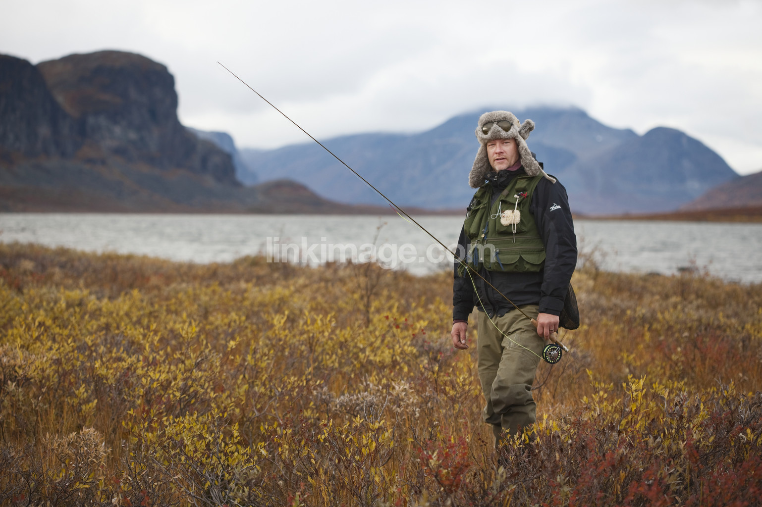 fishing, fish, fishing rod, cap, fur hat, grass, plants, water, river, mountain, rock, spot, nature, view