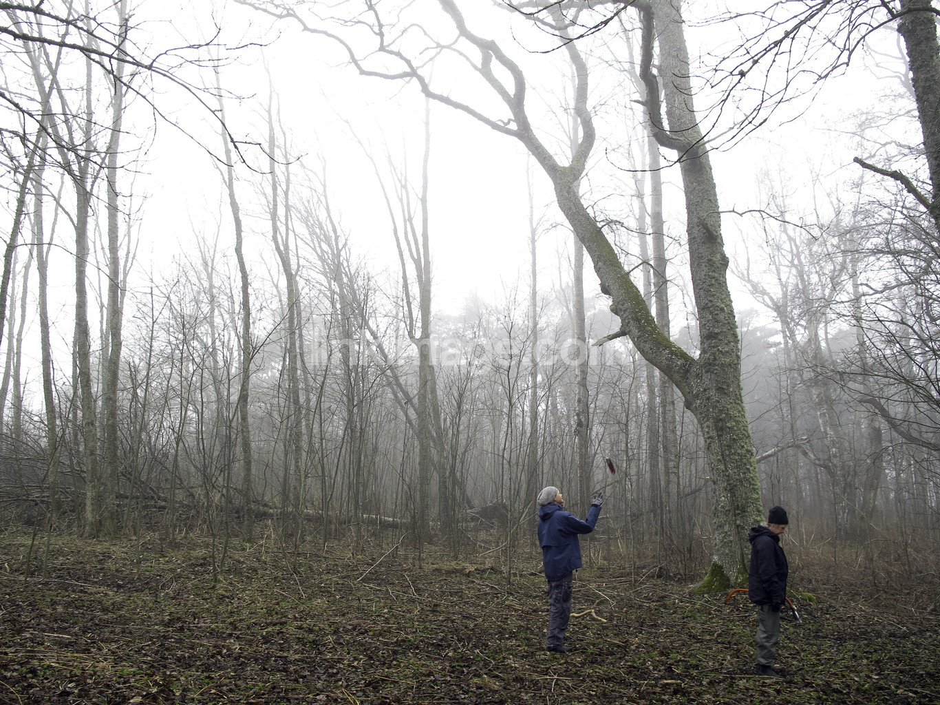 - nature, forest, spring, fog, people, two, tree, women, cut, work, bare, logging, open, fall