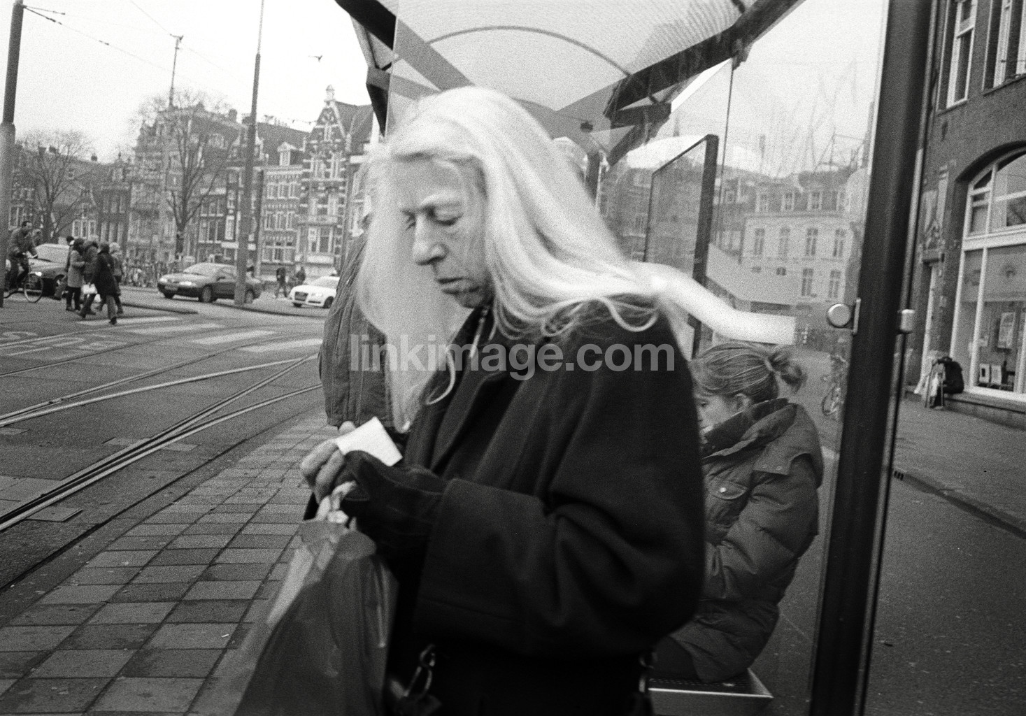 - female, old, wait, cure, buskur, grizzled, longhaired, far, gray, hair, bag, tram, stop, city, street
