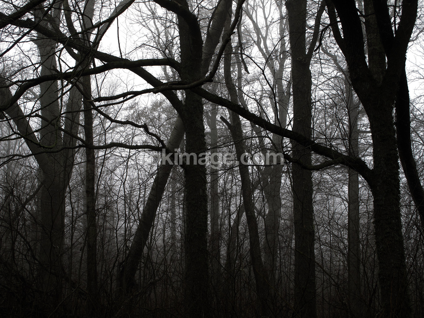 tree, tree trunks, branches, forest, hardwood, graphic, form, messy, spring, fall, haze, fog
