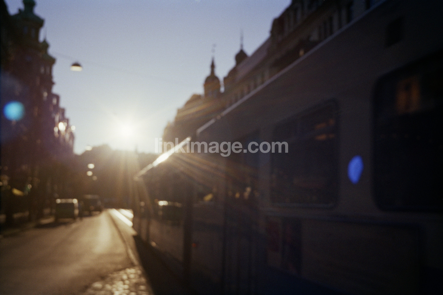 abstract, backlight, tram, light, sun, fall, street, blurred, city