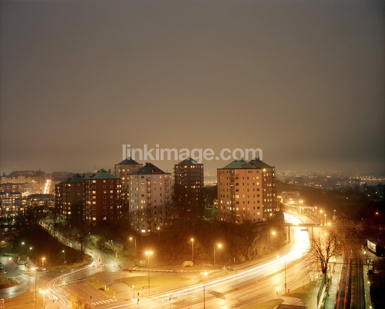 city, suburb, rise, night, evening, fall, house, apartment building, road, traffic, freeway, home, dusk
