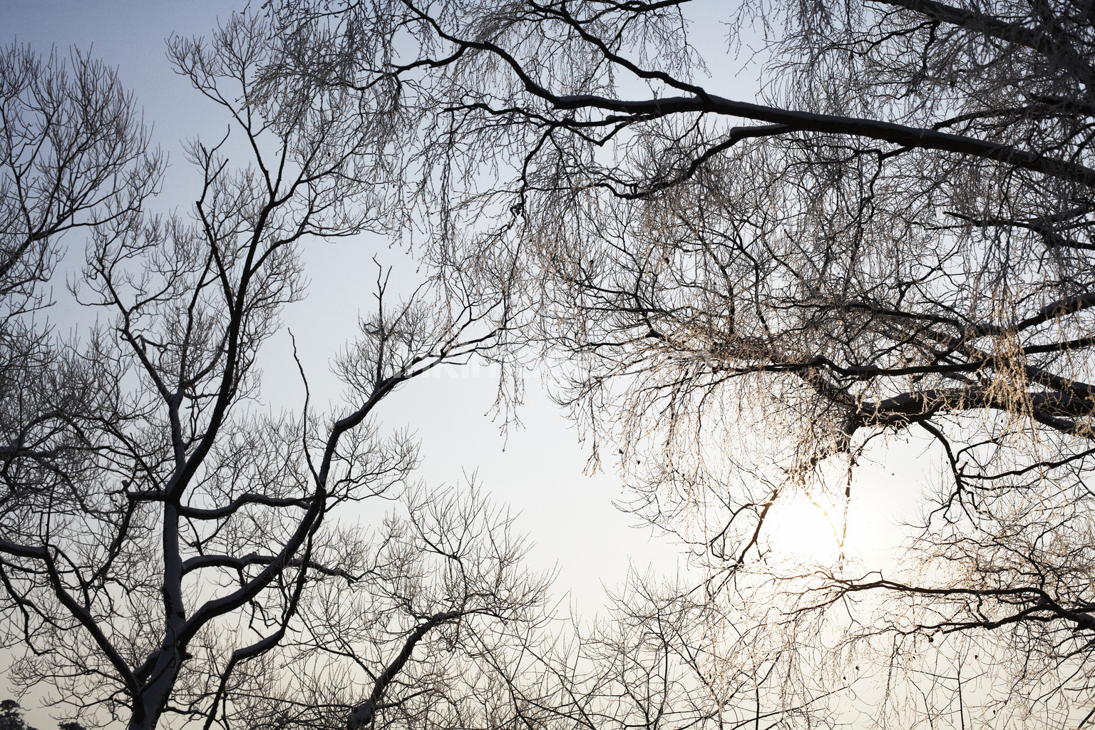 tree, branches, form, nature, winter, snow, ice, frost, forest, park, dusk, evening, sky