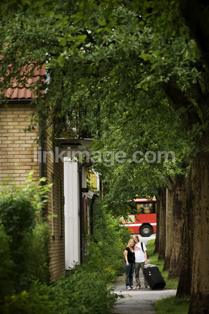couple, adolescents, trip, together, bus, bag, guy, boy, female, girl, holiday, hug, pavement