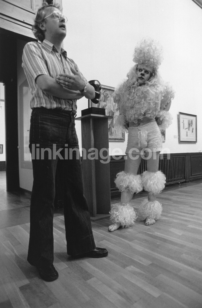 - male, museum, plaques, sculpture, wig, poodle, dog, disguised, painted, viewing, art, artist