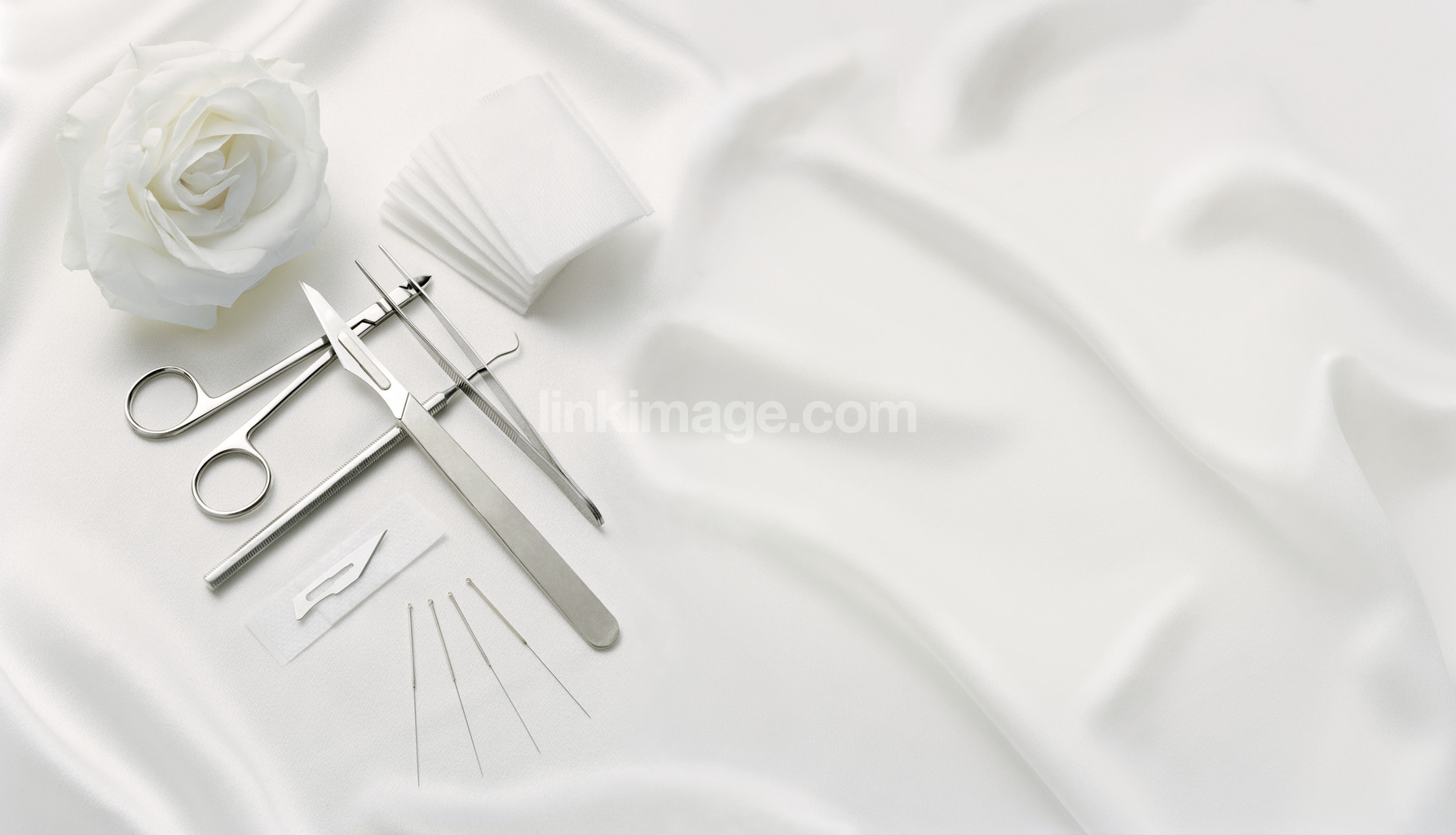 white, silk, skirt, soft, rose, flower, scalpel, scissors, needle, tweezers, fabric