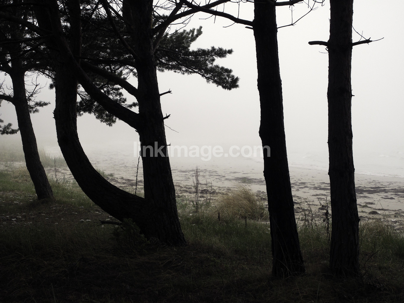 - shore, sandy beach, pine, tree, tree trunks, form, graphic, sand, fog, spring, fall