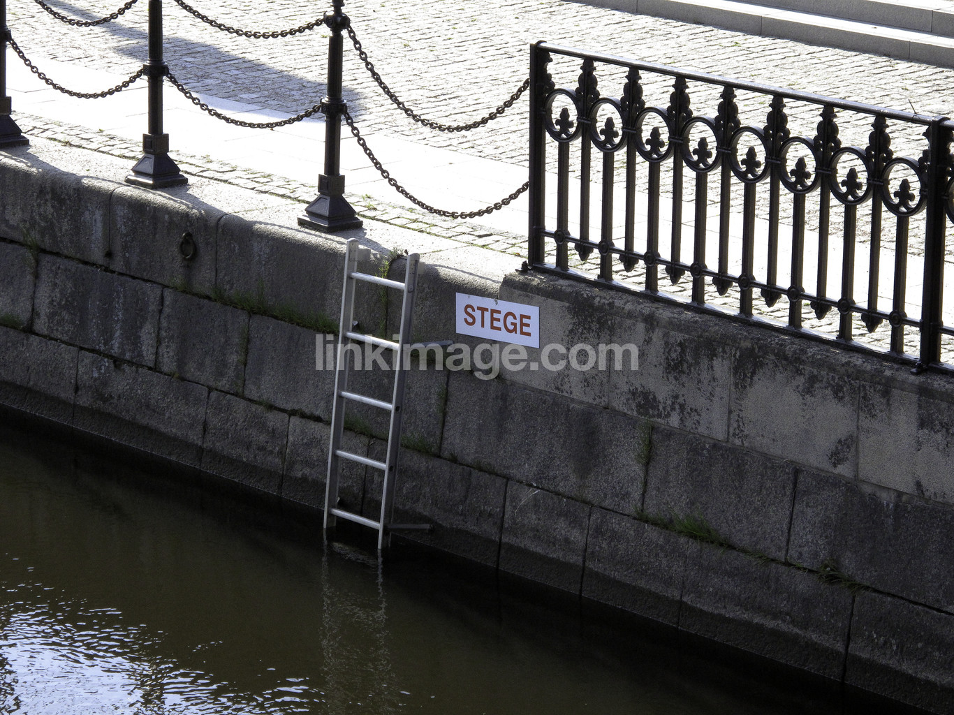 - water, ladder, enlightenment, fence, sign, channel, berth