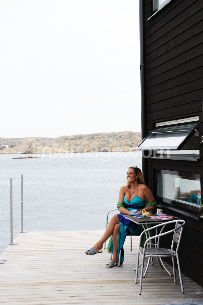 female, dress, dressed, terrace, table, bridge, decking, hotel, sea, rocks, archipelago