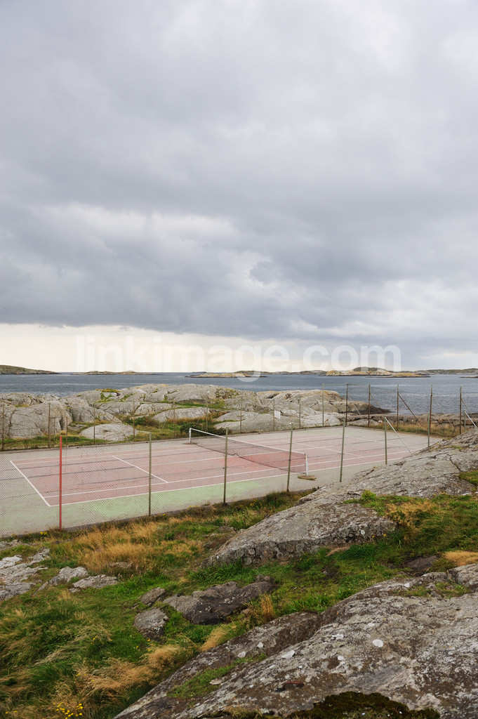 - sports, tennis, tennis court, fence, enclosed, rocks, sea, archipelago, cutting, island, cloud