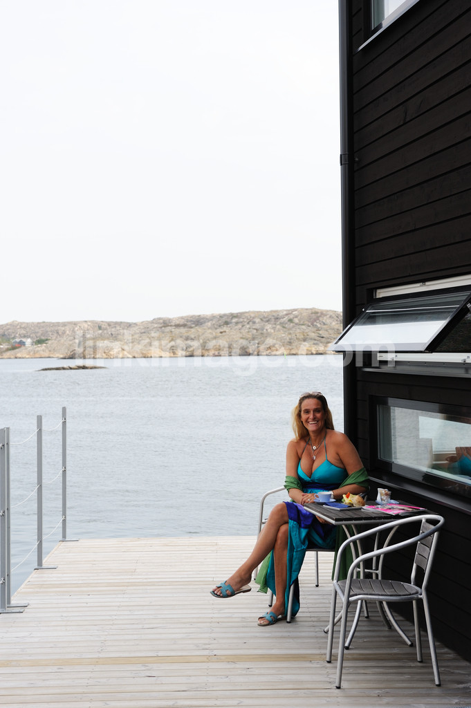 - female, girl, tan, blonde, happy, dressed up, bridge, terrace, porch, decking, table, chair, window, design, hotel, views, sea, rocks, archipelago