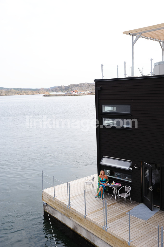 bridge, terrace, hotel, design, black, archipelago, hv, rocks, female, girl, dressed, table, sit, entrance, views