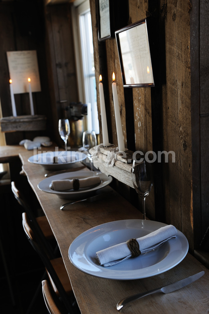 - restaurant, table, chairs, bar, speech-like, table setting, decoration, candles, marine, champagne glass, napkins, dark, wood