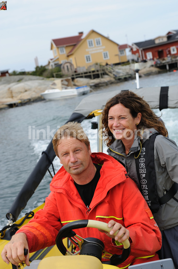 - male, driver, blonde, female, brunette, le, happy, life jacket, boat, run, go, steering wheel, port, bridge, house, villa, sea, rocks, swelling, wave, couple, love, close