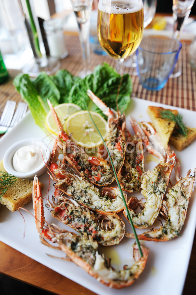 - seafood, chloro, crayfish, decorative, beer, dinner, meal, lemon, table setting, marine, glass, nubbe, salad