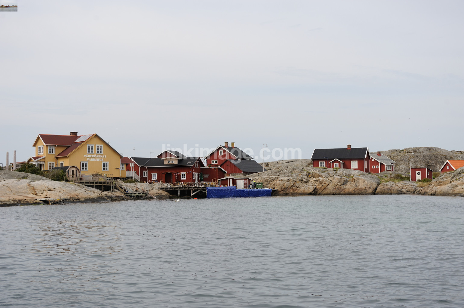 archipelago, bay, sea, water, rocks, stone, red, yellow, house, cottages, sheds, bridge, deck, port, island