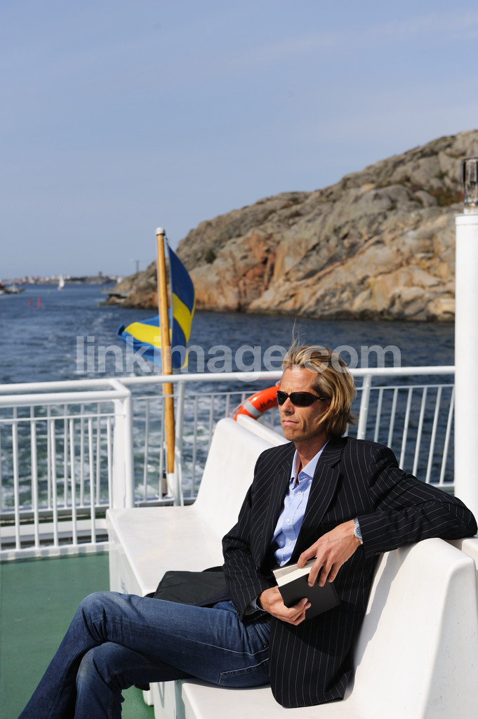 - male, guy, sunbathing, sunglasses, blazer, blonde, sofa, bar table, book, ferry, boat, sea, flag, archipelago, rocks