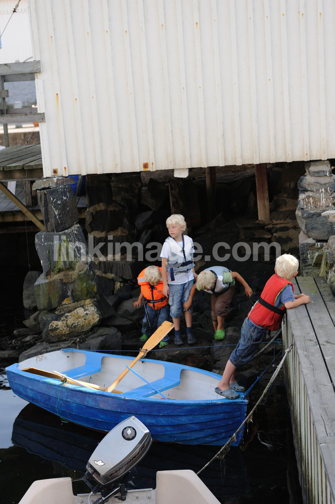 boys, rowboat, life jacket, bridge, oars, boat, blue, house, boathouse, stones, basic, deck, port