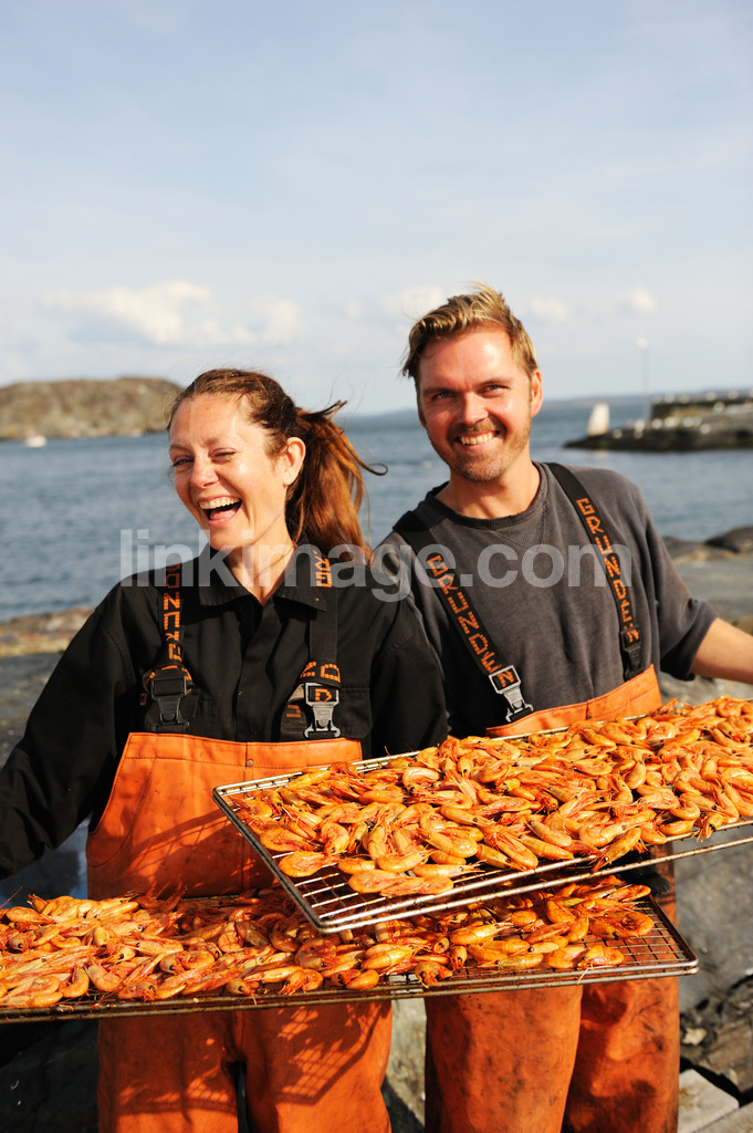 - shrimp, braces, orange, workwear, happy, laughter, girl, female, brunette, male, beard, blonde, rocks, sea, archipelago, worker, employed