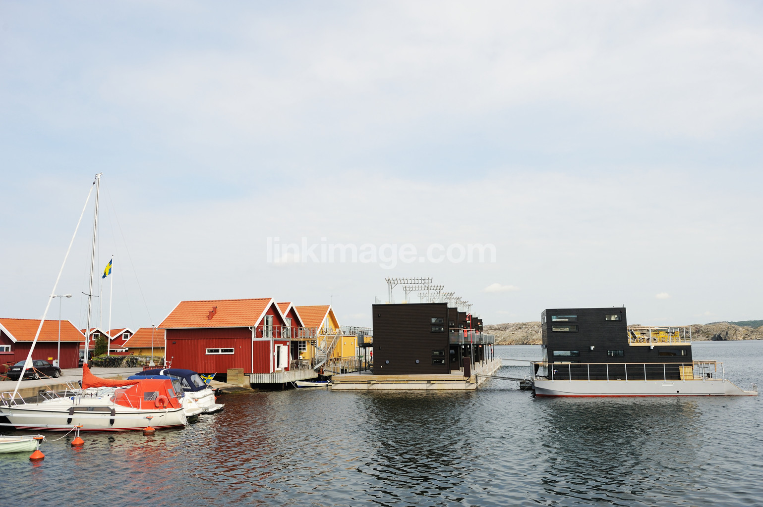 hotel, bridge, bridges, house, cottage, cottages, bod, sheds, modern, black, red, archipelago, protruding, sailboats, port