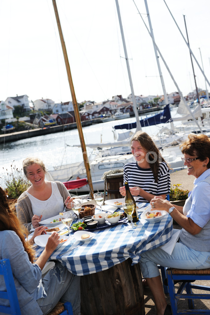 - dinner, restaurant, eat, happy, girls, outdoor dining, port, water, archipelago, wine, food, boats, sailboat, house, villas, company, four, 4