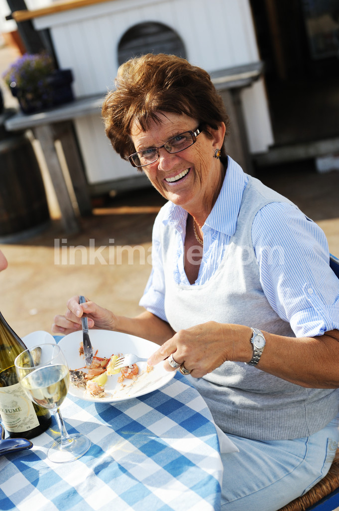 dinner, summer, outdoor dining, restaurant, wine, meal, aunt, lady, brunette, cloth, checkered, marine, clock, happy, laughter