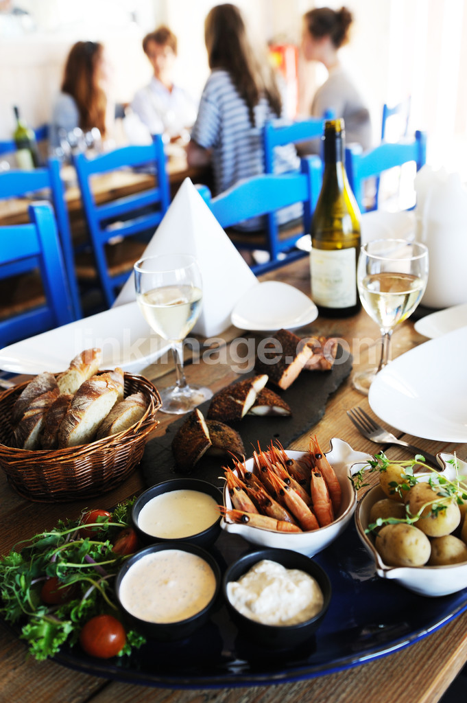 - restaurant, shrimp, potato, sauce, bowls, meal, bread, wine, plate, glass, table, marine, napkin, table setting, chairs, blue, people, eat, talk, archipelago