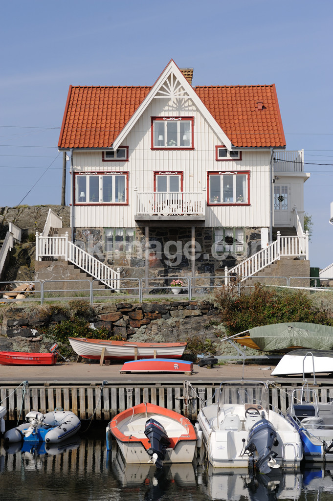 - villa, cottage, white, wood, stone, window, levels, centered, archipelago, steps, balcony, views, port, deck, bridge, berth, boat, boats, sky, blue, idyll, country place, fence, sea