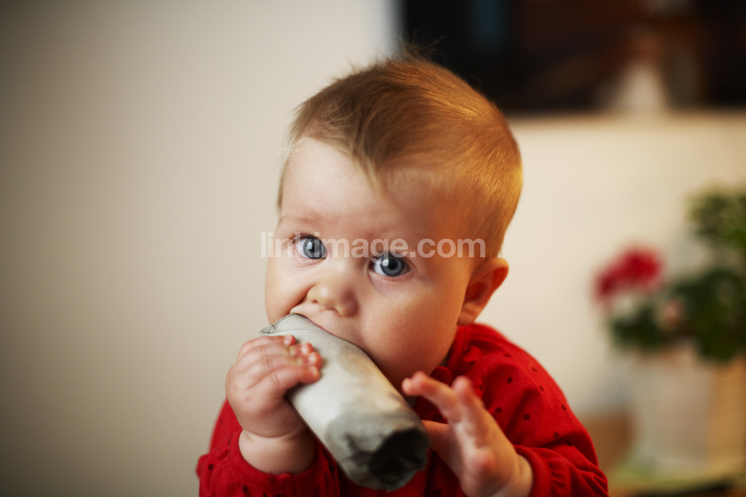children, baby, face, mouth, nose, eyes, gaze, toilet paper roll, eat, bite, hands, hair